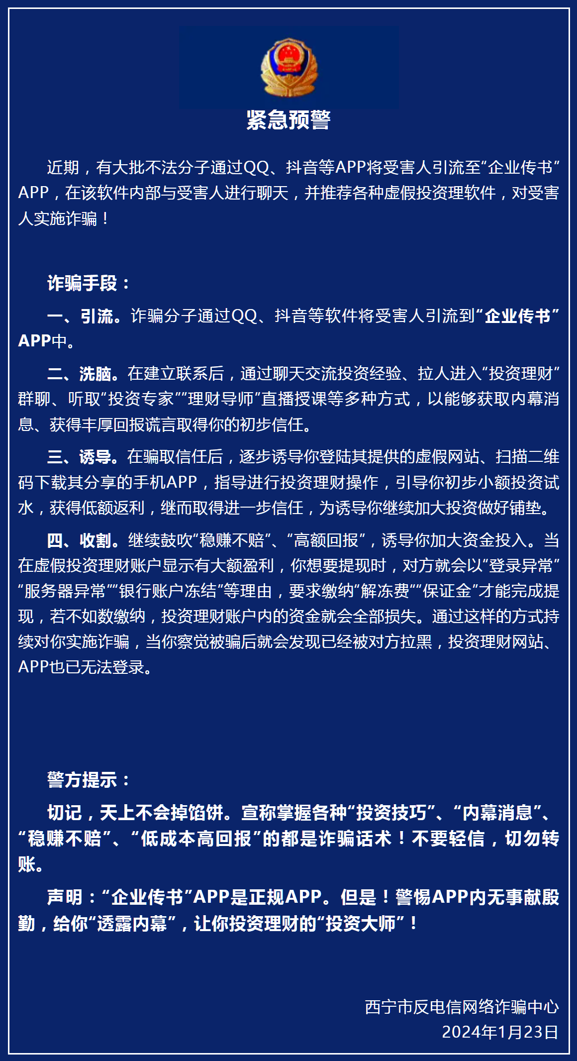 预警|谨防不法分子通过 “企业传书” APP 实施投资理财类诈骗